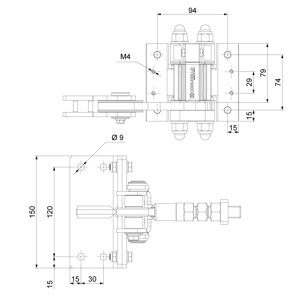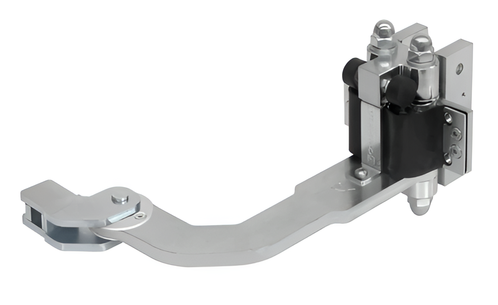 - Horní pant s převodem — montovaný v horní části brány u sloupku, synchronizuje pohyb obou křídel