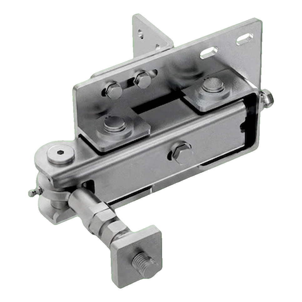 - Dolní pant s převodem a ramenem — montovaný ve spodní části křídla brány, odpovědný za pohon skládání; oboustranně skládací převodové rameno se spojuje se spodem prvního křídla