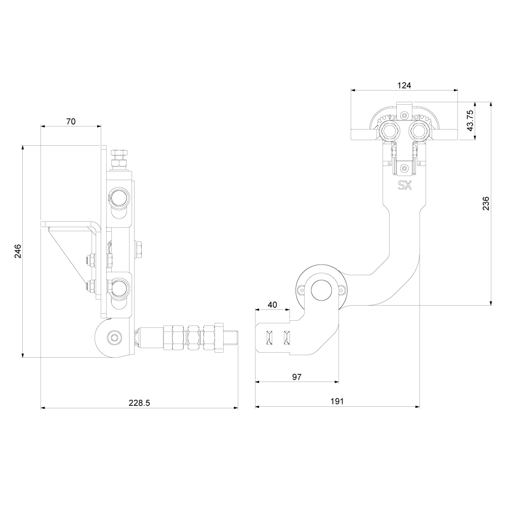 - Nastavitelný nosník — připevněný ke sloupku, umožňuje precizní nastavení celého systému po montáži
