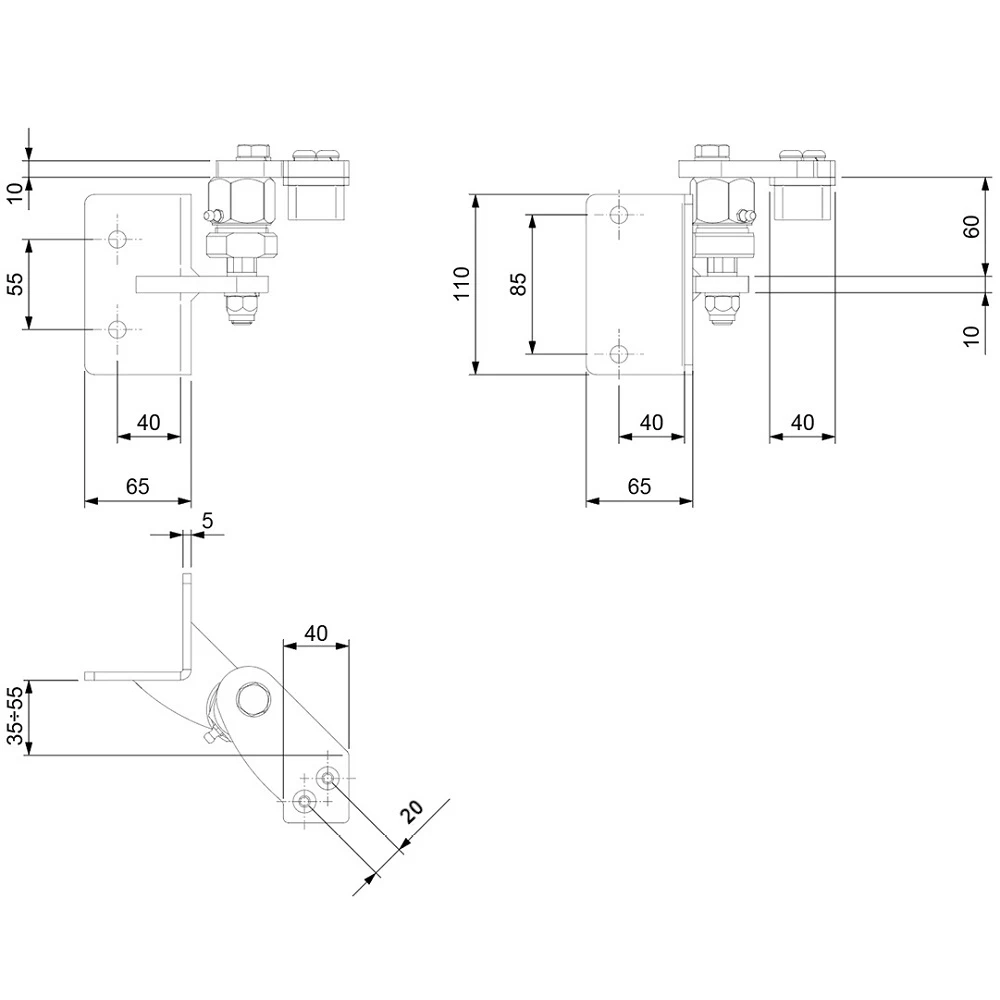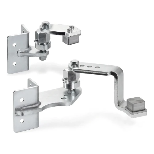 Sada je určena k montáži svařováním – nosníky se připevňují přímo ke sloupku a kloub k rameni křídla brány. Výstředníková regulace umožňuje korekci nastavení křídla po montáži, což výrazně zkracuje čas instalace a eliminuje nutnost demontáže v případě drobných úprav. Mazničky vestavěné v kloubech zajišťují bezúdržbový provoz – stačí pravidelné mazání bez sundávání závěsů.