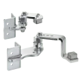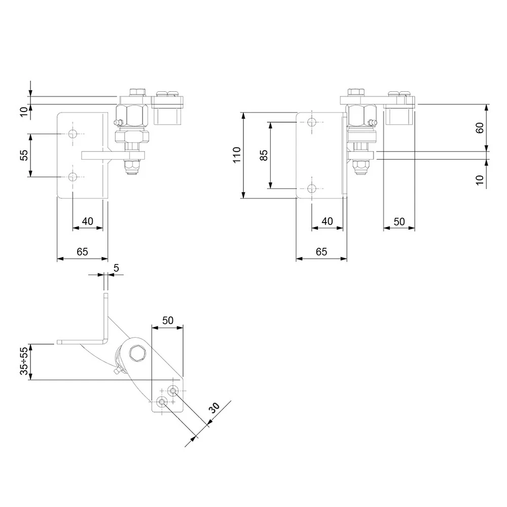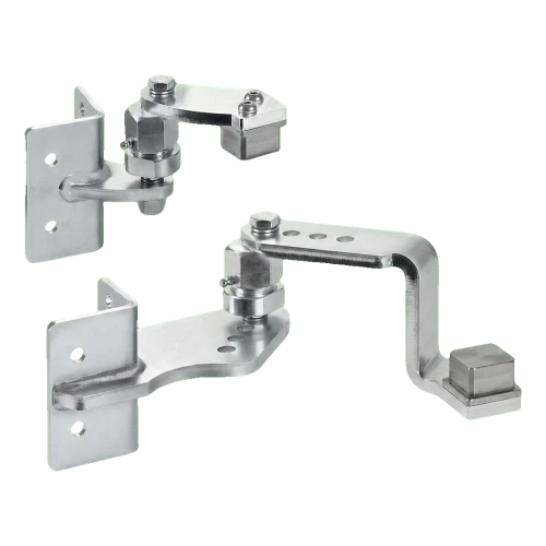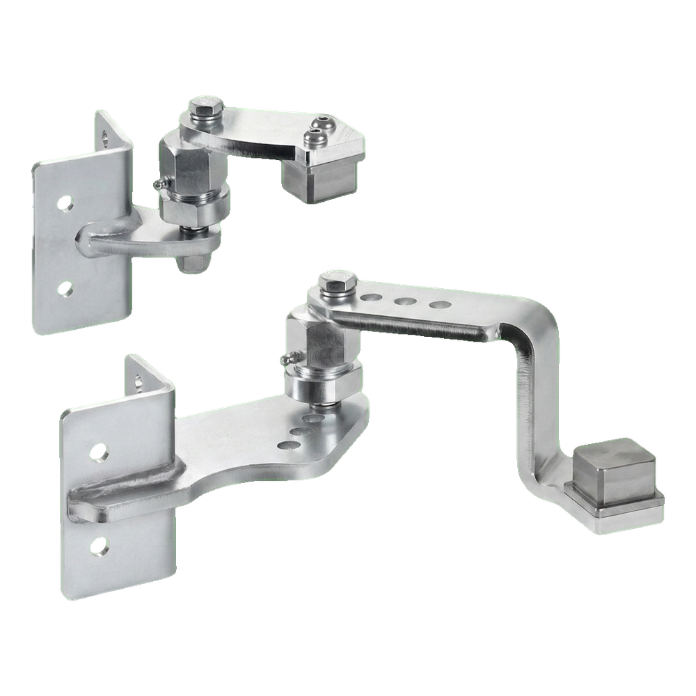 Závěsy jsou určeny pro navařování na ocelové sloupky 50×50 mm a pro montáž na betonové sloupky pomocí montážních otvorů. Kloubový mechanismus s excentrickým šroubem umožňuje plynulou regulaci úhlu a úrovně křídla brány po montáži — není potřeba dokonalého vyrovnání sloupků ve fázi betonování. Mazničky vestavěné v kloubech zajišťují snadnou údržbu — stačí pravidelné mazání bez nutnosti demontáže celého závěsu.