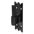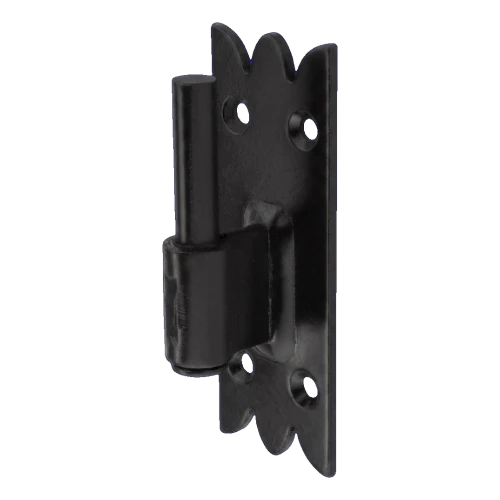 Dekorativní stavební okenicový hák v černé barvě určený pro pohyblivé spojení okenice se zárubní nebo rámem. Dekorativně zpracovaný montážní plech s charakteristickým vzorem zubovaných okrajů umožňuje esteticky začlenit hák do tradičních a rustikálních fasád. Solidní konstrukce z pozinkované oceli chráněné olejovým lakem zajišťuje vysokou odolnost proti korozi a mechanickému poškození — i v náročných atmosférických podmínkách.