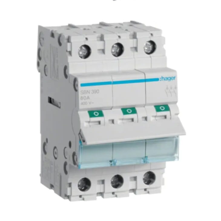 Odpojovač izolačního spínače 3P 100A 400V AC SBN390 HAGER je typ elektrického spínače, který plní několik funkcí: vede proud za jmenovitých podmínek a při přetížení (včetně zkratu po stanovenou dobu), odpojuje obvod za jmenovitých i poruchových podmínek a izoluje, přičemž splňuje požadavky na izolační vlastnosti pro bezpečný provoz zařízení.