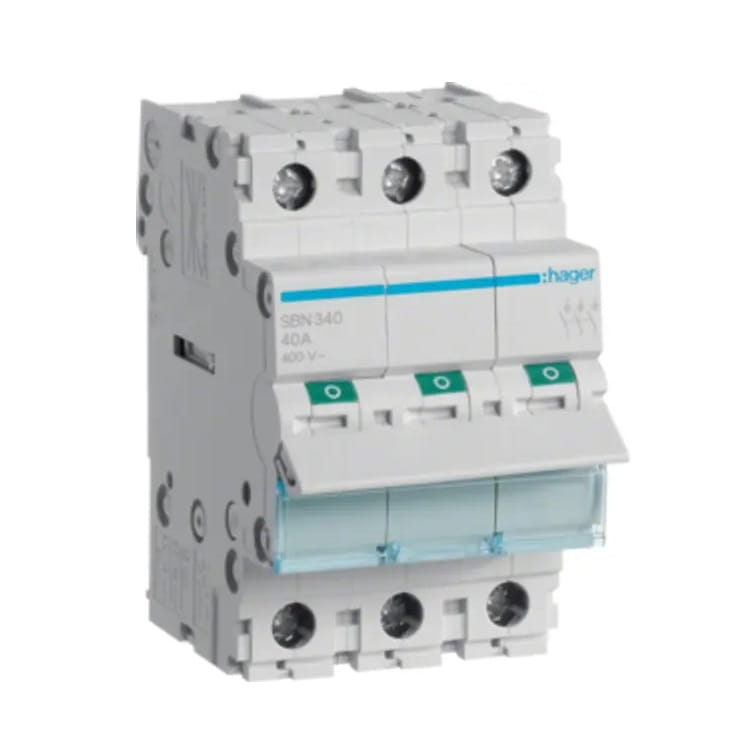 Odpojovač izolačního spínače 3P 40A 400V AC SBN340 HAGER je typ elektrického spínače, který plní několik funkcí: vede proud za jmenovitých podmínek a při přetížení (včetně zkratů po stanovenou dobu), odpojuje obvod za jmenovitých i poruchových podmínek a izoluje, přičemž splňuje požadavky na izolační vlastnosti pro bezpečný provoz zařízení.