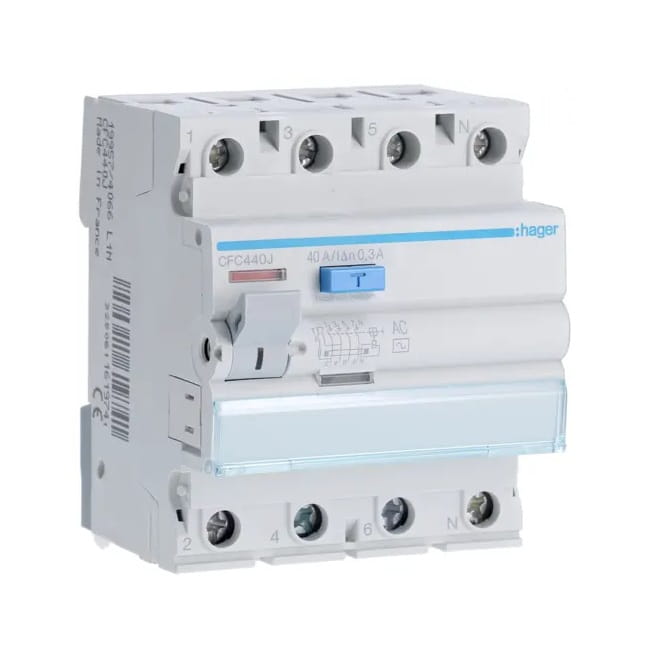 Proudový chránič 3P+N 40A 300mA typ AC CFC440J značky HAGER je zařízení, které chrání před úrazem elektrickým proudem a je používán jako doplňková forma ochrany (ochrana při nepřímém dotyku), když základní ochranná opatření selžou nebo budou poškozena.