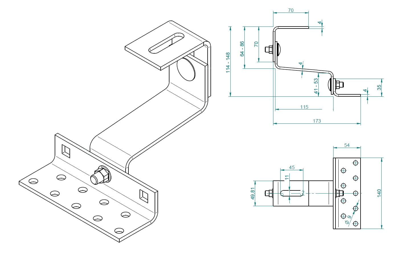 - Široká a nastavitelná konzola je vyrobena z plechu o tloušťce 4 mm a 5 mm, a zetka z plochého profilu 30x5 mm.