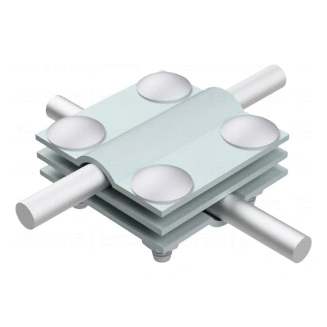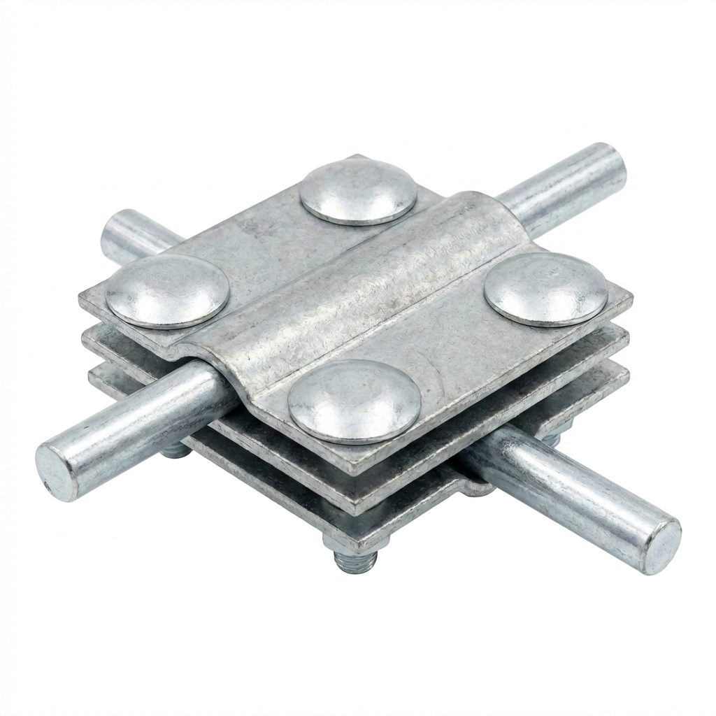 Křížový konektor 4-otvorový 3-deskový slouží k vytváření trvalých křížových spojů kulatých a plochých vodičů v hromosvodních instalacích. Jedná se o spolehlivý prvek systému ochrany před bleskem, který se osvědčí jak na střechách, tak v pozemních instalacích. Konstrukce se 3 deskami zajišťuje zvýšenou stabilitu a jistotu spojení.