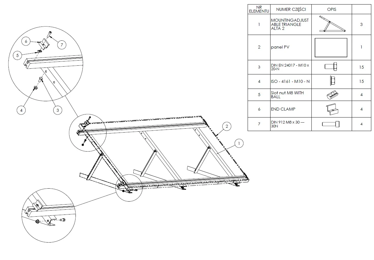 - Trojúhelníky vyrobené z úhelníku 40×40×3mm. Výrobek je vyroben z hliníku 6060, což zaručuje lehkost konstrukce, odolnost vůči mechanickému přetížení a odolnost vůči nepříznivým povětrnostním podmínkám.