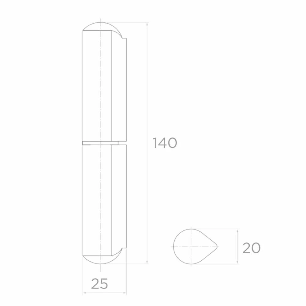 Válcový závěs pro svařování PSG o rozměrech D20 × H140 × L25 mm je solidní prvek určený pro montáž bran a bránek. Vyrobený z vysoce kvalitní oceli, zaručuje trvanlivost, odolnost vůči zatížení a bezporuchový provoz po léta. Kapkovitý profil zajišťuje stabilní usazení po přivaření ke nosné konstrukci a válcová konstrukce umožňuje plynulý pohyb křídla brány bez trhání a nadměrného tření.