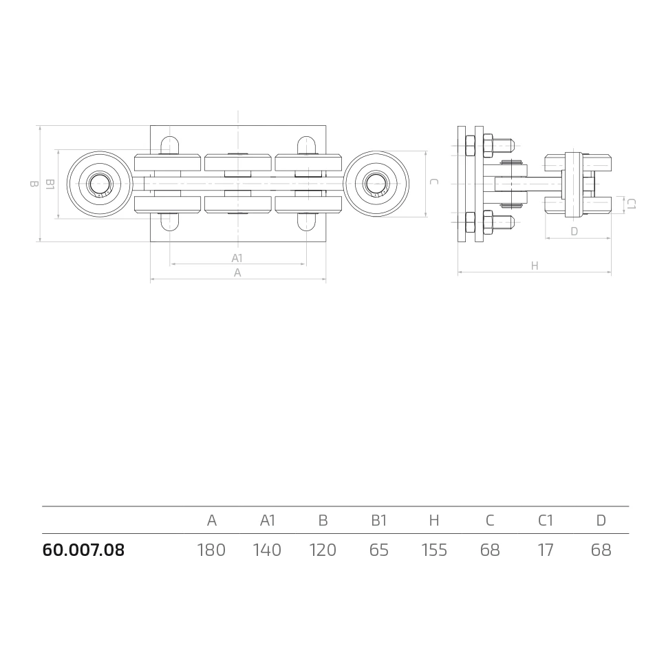 Pojezdový vozík 80/8 je odolný, 8-kladkový nosný prvek určený pro závěsné posuvné brány. Díky použití osmi ocelových kladek na ložiscích zajišťuje plynulý a tichý chod křídla brány i při vysokém zatížení — maximální nosnost činí 1000 kg. Jedná se o spolehlivé řešení pro profesionální instalace průmyslových a areálových bran.