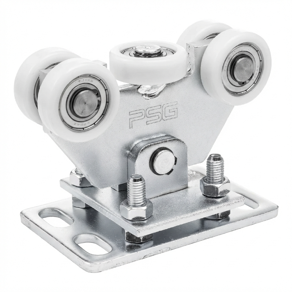 Kompletní sada pojezdových vozíků s příslušenstvím – hotové montážní řešení pro samonosné posuvné brány. Sada obsahuje vše, co potřebujete ke správnému zavěšení a stabilizaci brány na kolejnici 80×80×5 mm: dva pojezdové vozíky, nájezdový váleček s ochranným zakončením a nájezdový držák.