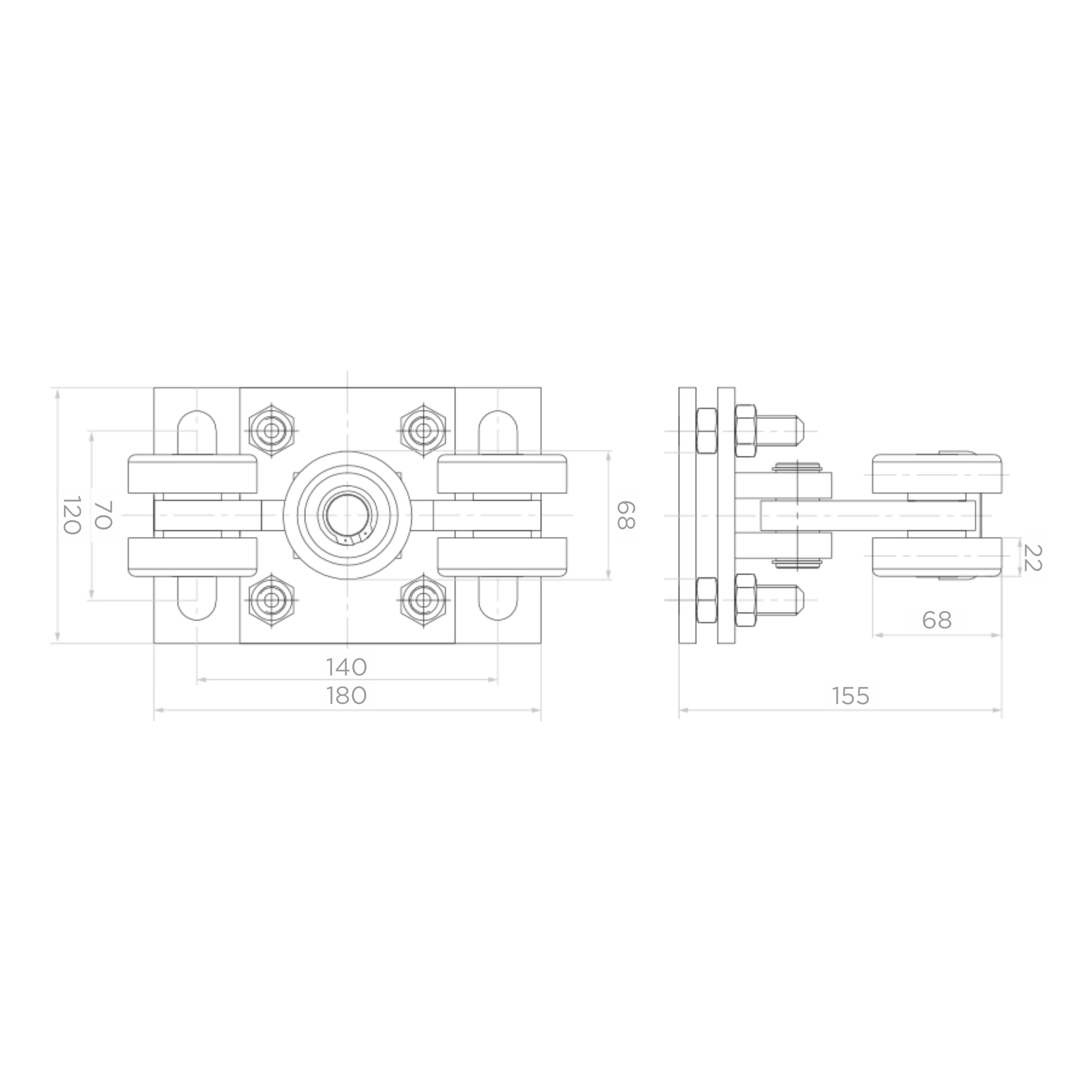 Rozměry vozíku: základna 180×120 mm, rozteč úchytů 140×70 mm, celková výška 155 mm, šířka koleček 68 mm.