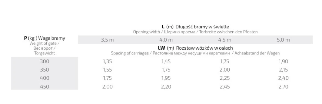 Volba rozteče vozíků – správná rozteč vozíků v osách závisí na hmotnosti brány a délce průjezdného otvoru ve světlosti. Pro brány o hmotnosti 300 kg a otvoru 3,5 m činí rozteč 1,35 m, zatímco pro brány o hmotnosti 450 kg a otvoru 5,0 m je to až 2,70 m. Podrobné hodnoty pro všechny kombinace najdete v technické tabulce.