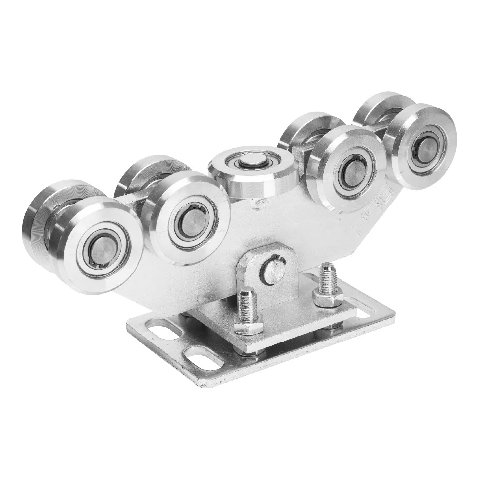Pojezdový vozík vybavený 9 ocelovými kladkami s ložisky zajišťuje mimořádně plynulý a tichý pohyb brány. Konstrukce s výškovou regulací pomocí šroubů umožňuje přesné nastavení brány vůči rovině, což vede k rovnoměrnému rozložení zatížení a menšímu opotřebení kladek. Každý vozík je přizpůsoben pro lištu o rozměrech 80×80×5 mm a vydrží zatížení až 1000 kg.