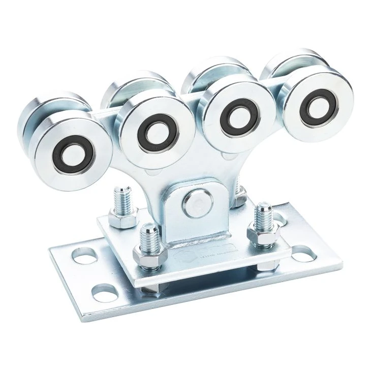 Dva pojezdové vozíky zajišťují vedení a podpírání křídla brány. Každý je vybaven 8 kladkami z plastu rozmístěnými ve dvou úrovních, což zajišťuje rovnoměrné vedení a stabilizaci křídla. Plastové kladky pracují tiše a nevyžadují časté mazání, přičemž kuličková ložiska 6201 RS s gumovým těsněním zaručují nízký odpor při valení a ochranu před nečistotami.