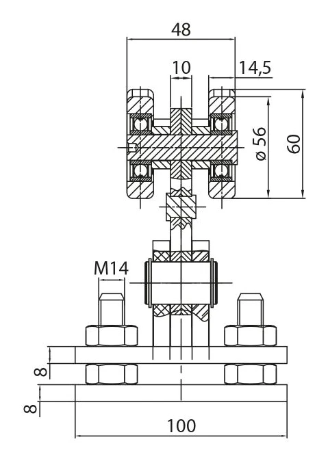 Výkres s rozměry zobrazuje průřez pojezdového vozíku s vyznačenými klíčovými kótami. Dvouúrovňové uspořádání kladek zajišťuje optimální rozložení sil a dvojitá základová deska s nastavením šrouby M14 umožňuje přesné nastavení výšky a svislosti křídla brány po montáži.