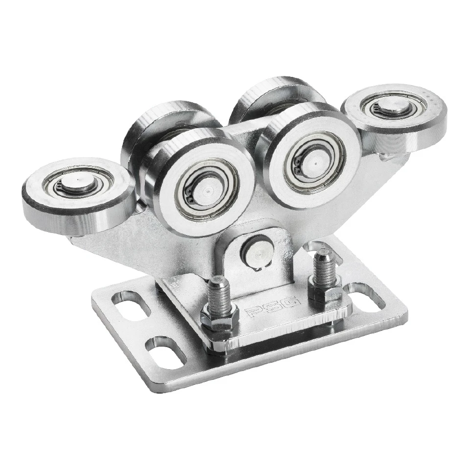 Pojezdový vozík s 6 ocelovými kladkami (včetně dvou horizontálních kladek) tvoří srdce posuvného systému. Kyvná konstrukce spojená se základnou pomocí čepu umožňuje automatické přizpůsobení se kolejnici brány, čímž eliminuje napětí a zajišťuje rovnoměrné rozložení hmotnosti.
