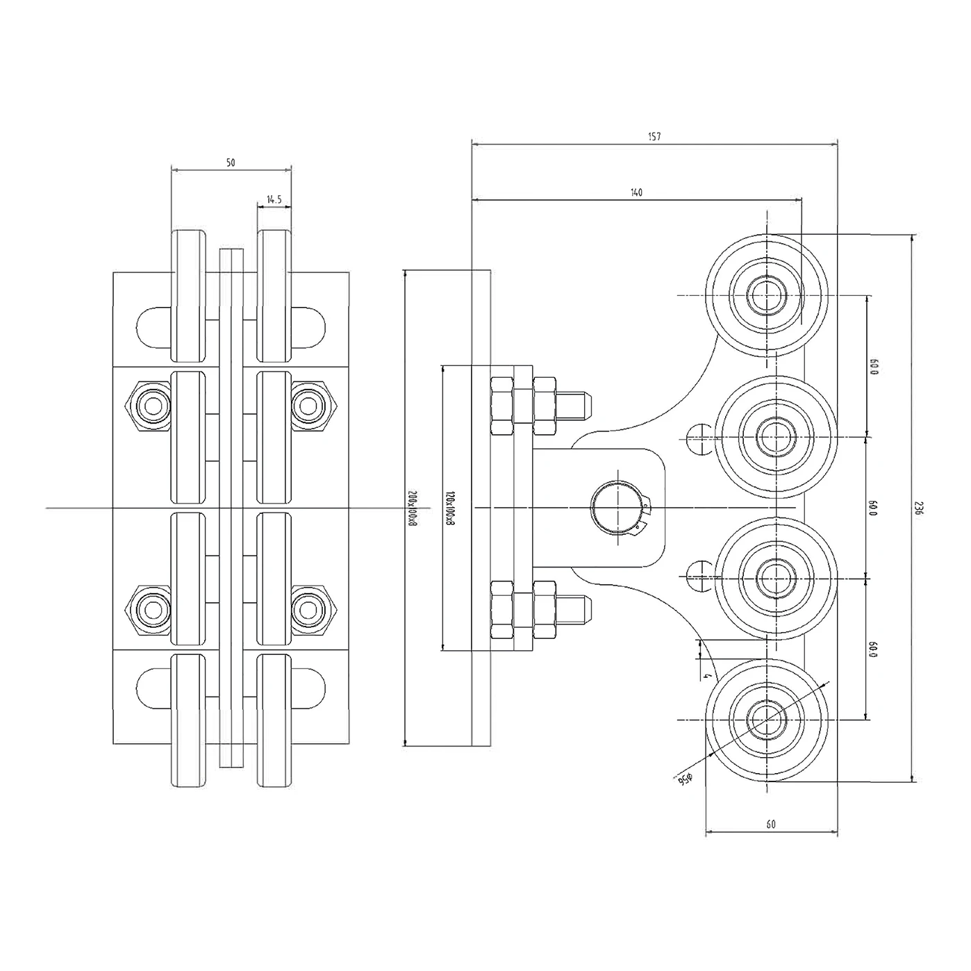 - Pojezdový vozík – 2 ks (8 ocelových kladek na dvou úrovních, kuličková ložiska 6201 RS)