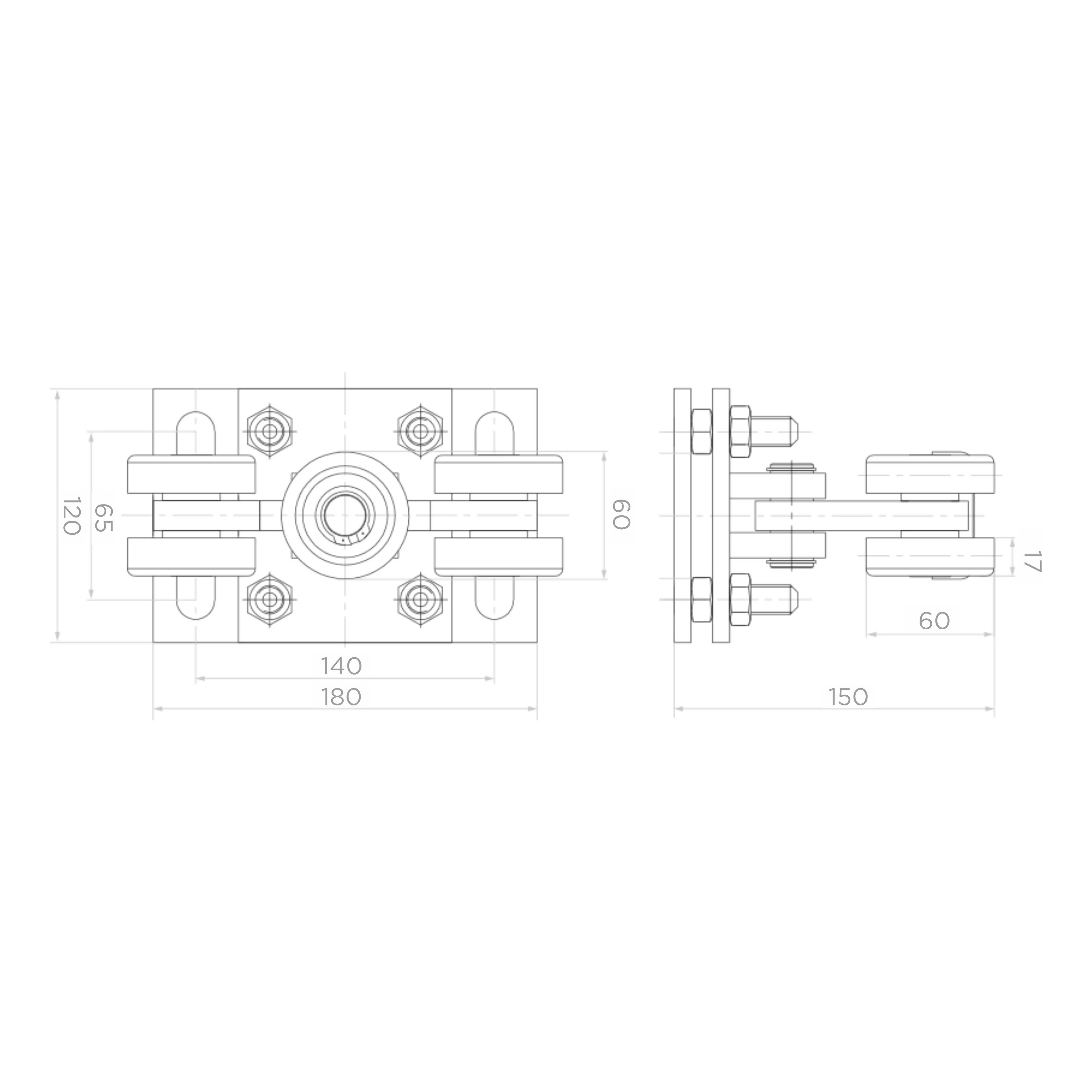- Pojezdový vozík – 2 ks – kyvný vozík s 5 kovovými kolečky (z toho jedno horizontální), s nastavením výšky pomocí šroubů, určený pro kolejnici 70×70×4 mm