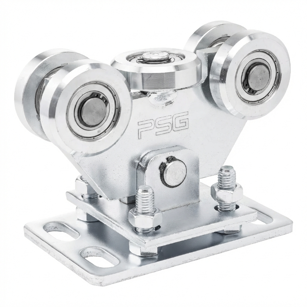 Pojezdový vozík je vybaven 5 kovovými kolečky, z nichž jedno je vodorovné a zajišťuje dodatečnou stabilizaci vedení brány. Kyvná konstrukce – vozík je spojen se základnou pomocí čepu, díky čemuž se automaticky přizpůsobuje kolejnici posuvné brány. Nastavení výšky pomocí šroubů umožňuje přesné seřízení brány při montáži.