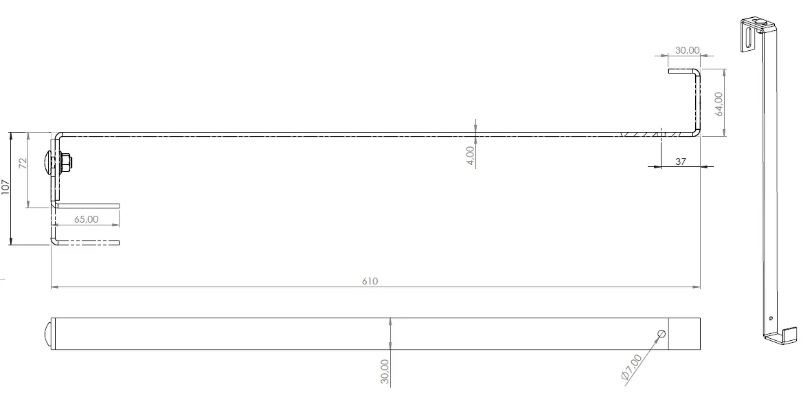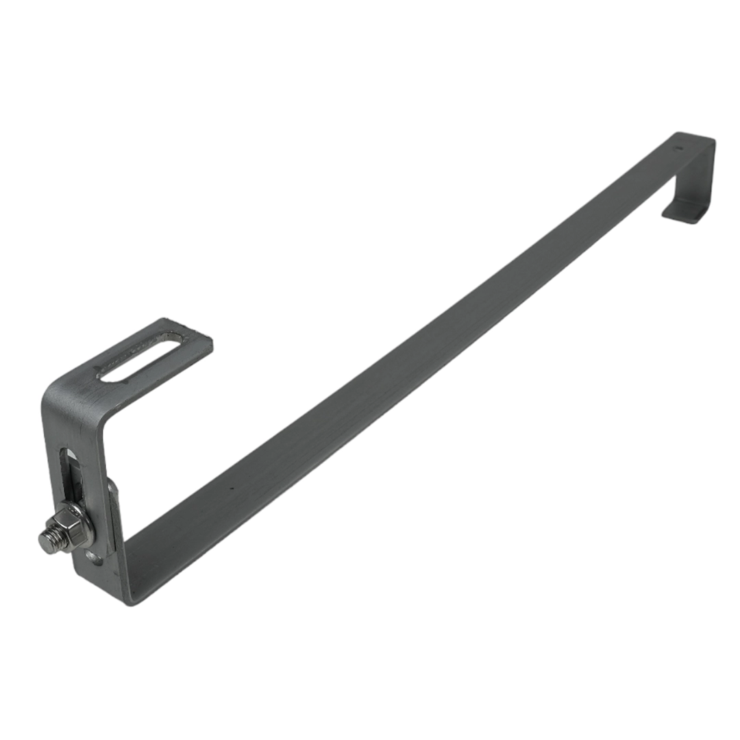 Nastavitelný střešní hák S pro šikmé střechy, nerezová ocel 1.4016 o rozměrech 610x30x4 mm s otvorem M10 pro profil k fotovoltaickým systémům.