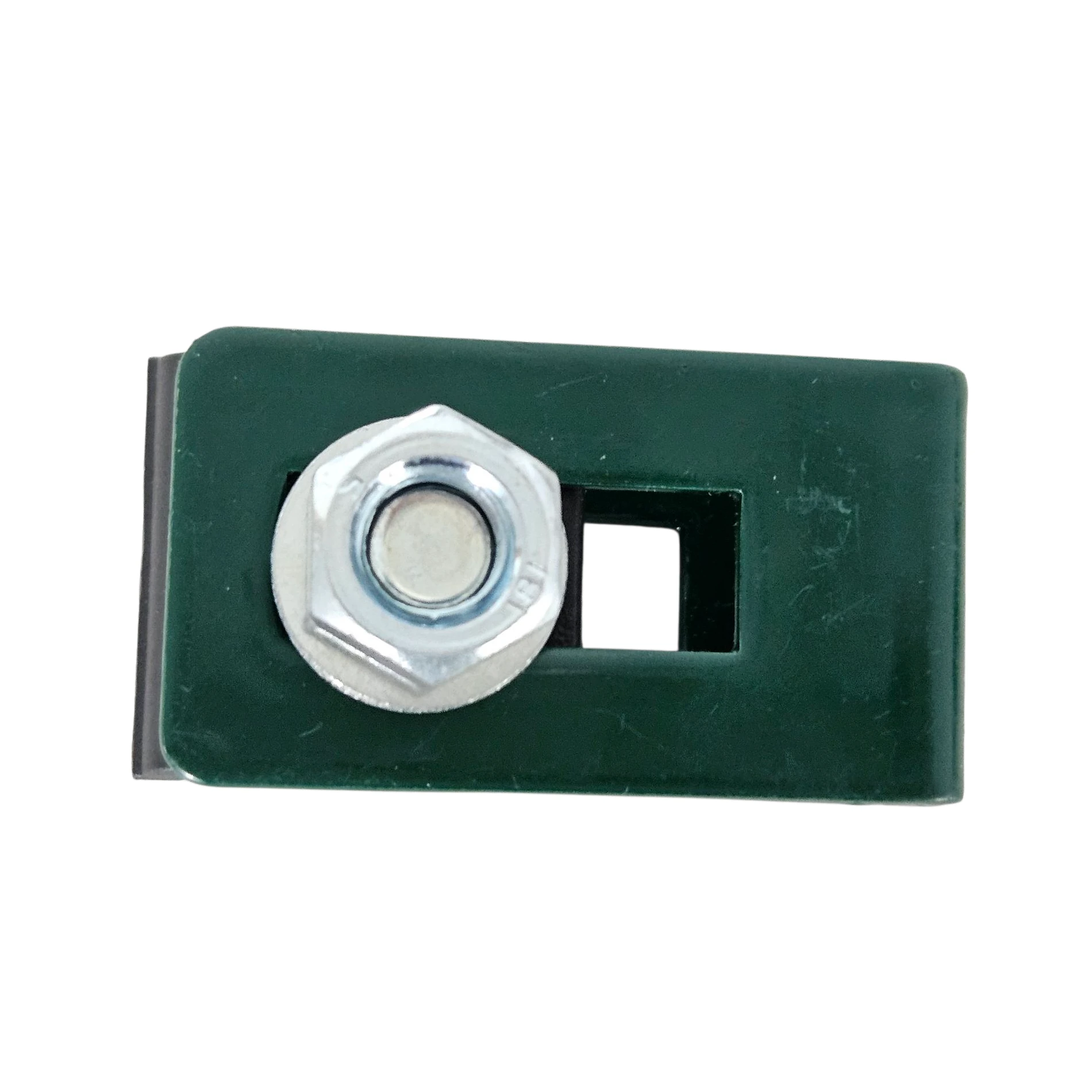Univerzální objímka držák spojka pro plotové panely zelená určená pro sloupky s různými průřezy díky univerzálnímu tvaru.
