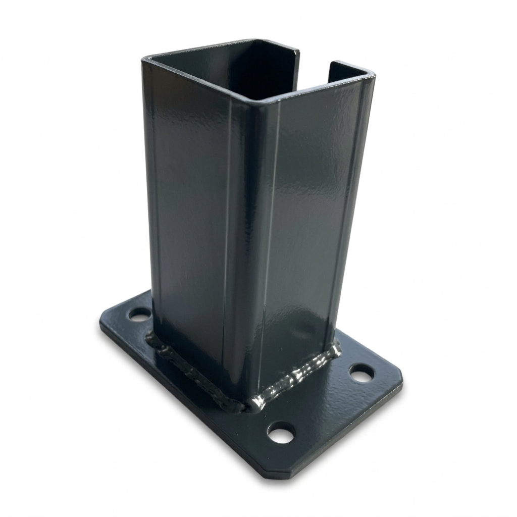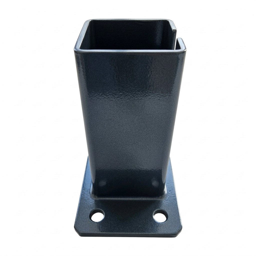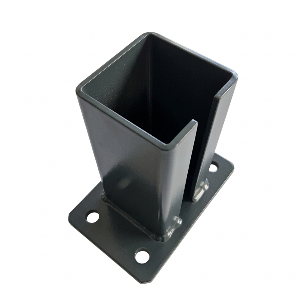 Ocelová základová patka pro sloupek brány a oplocení 80×80 mm v barvě grafit antracit RAL 7016 je odolný montážní prvek umožňující rychlé a spolehlivé kotvení profilových sloupků k betonovým povrchům, zídkám a dalším zpevněným podkladům. Díky úpravě práškovým lakováním v barvě RAL 7016 produkt zajišťuje estetický, jednotný vzhled ideálně komponující se s moderními panelovými ploty a branami v nejoblíbenějším odstínu antracitu — při současné účinné antikorozní ochraně.