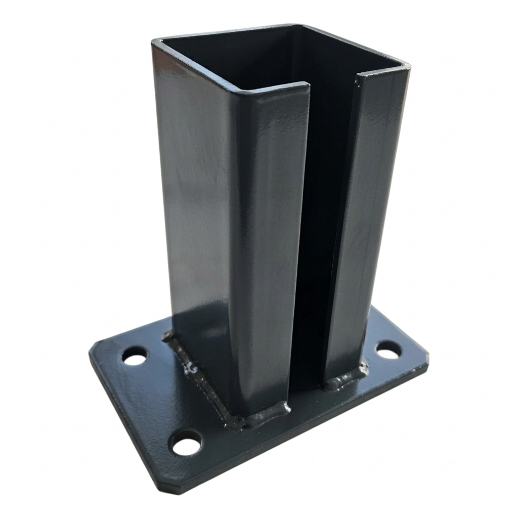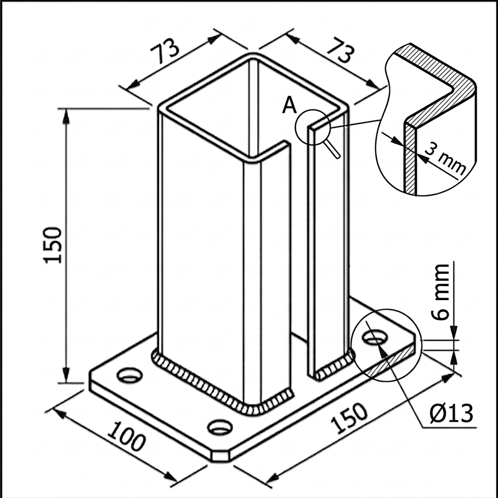 Konstrukce se skládá z otevřeného čtvercového profilu 73×73 mm (přizpůsobeného sloupku 80×80 mm) přivařeného k masivní montážní desce se čtyřmi otvory pro kotevní šrouby. Koutový svar u základny profilu zaručuje spolehlivé přenášení zatížení. Svislá štěrbina v profilu umožňuje přesné přizpůsobení a kompenzaci tolerancí sloupku.