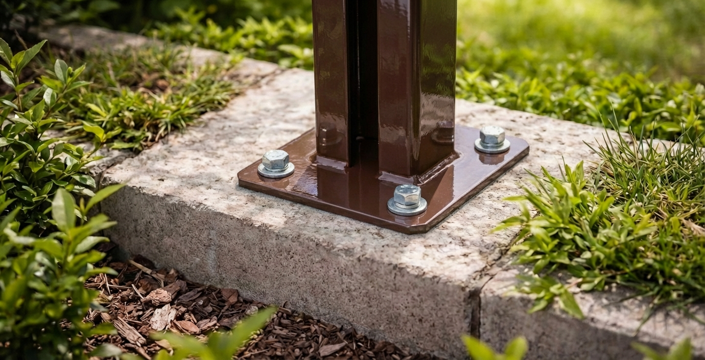Patka plotového sloupku 60×40 mm je odolná ocelová konzole určená k montáži panelových sloupků na betonový podklad. Díky galvanickému zinkování a práškovému lakování v hnědé barvě (RAL 8017) zajišťuje produkt účinnou antikorozní ochranu i estetický vzhled — ideální pro venkovní aplikace.