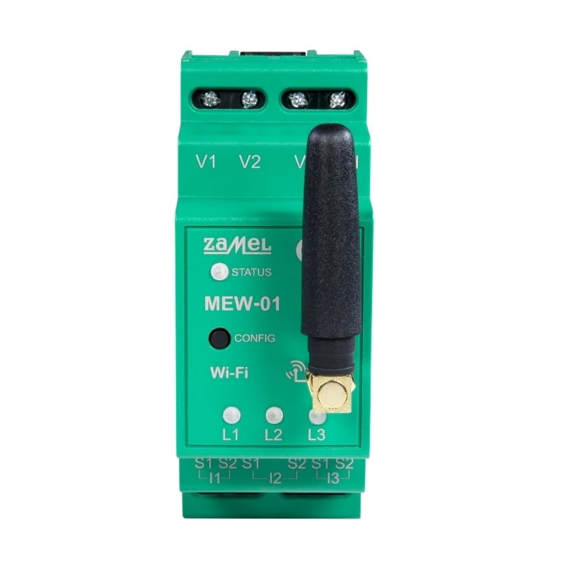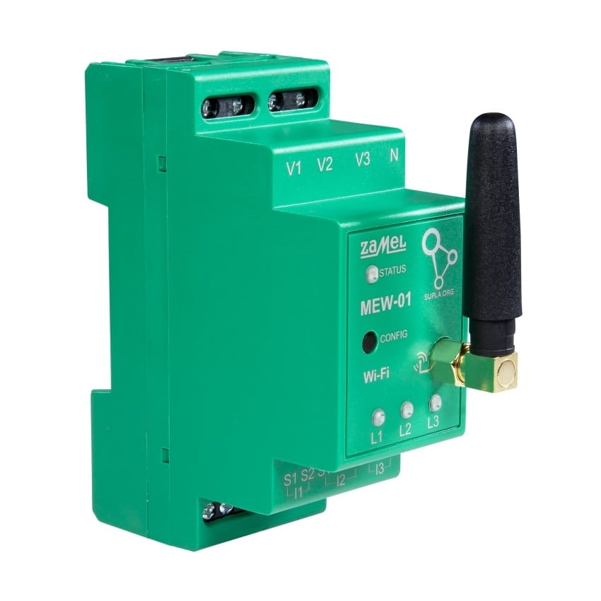 Monitor elektrické energie WI-FI 3F+N obousměrný elektroměr pro fotovoltaiku FV TYP: MEW-01 SUPLA značky ZAMEL umožňuje bezdrátové monitorování spotřeby energie přes síť Wi-Fi. Jedná se o třífázové zařízení, které se instaluje v elektrickém rozvaděči na lištu TH35 (DIN), aniž by vyžadovalo speciální elektrické či telekomunikační instalace.