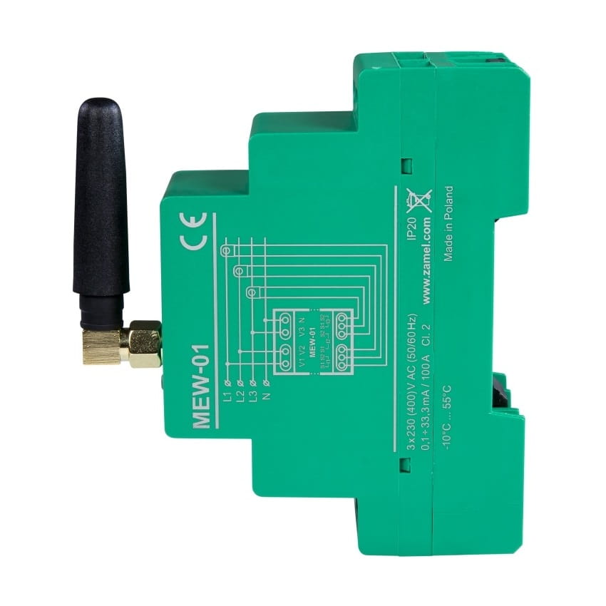 Monitor zabírá dva moduly a je vybaven proudovými transformátory 100A a anténou (součástí balení). V případech, kdy musí být anténa namontována vně rozvaděče, zejména u kovových rozvaděčů, je nutné použít externí anténu s konektorem typu SMA. MEW-01 umožňuje také měření spotřeby energie v jednofázovém zapojení.