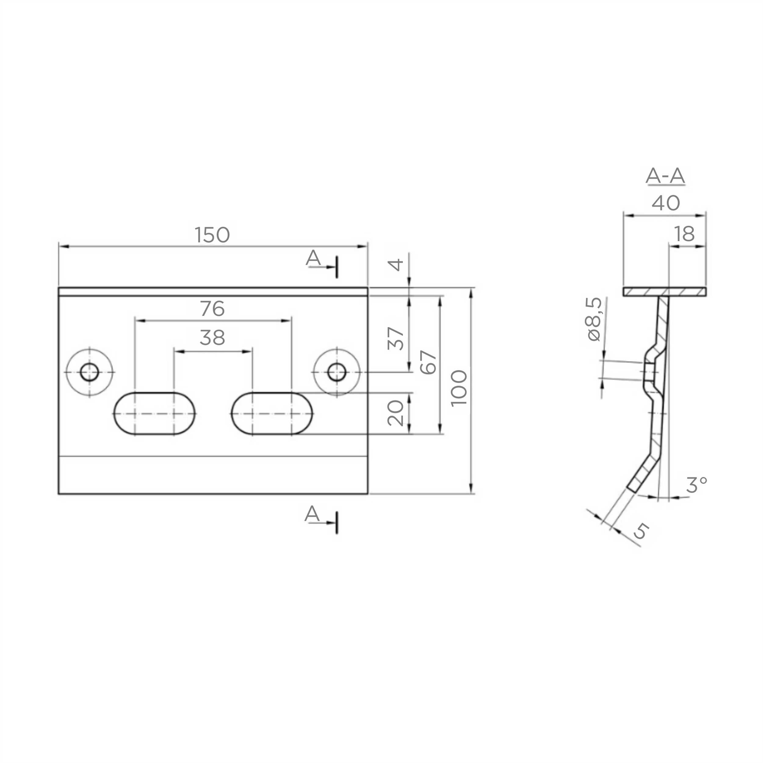 - Průměr montážních otvorů: Ø 8,5 mm (pro šrouby s kuželovitou hlavou)