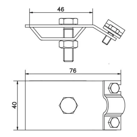 Rozměry a montáž. Kompaktní konstrukce (76 × 46 × 40 mm) usnadňuje montáž i na těžko přístupných místech. Držák se nasadí na okraj okapu a poté se dotáhnou šrouby — hromosvod je pevně uchycen bez rizika uvolnění vlivem větru či vibrací.